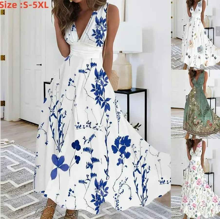 2025 Women's Summer Casual Dress Elegant Party Sleeveless Long Dress Robe Sexy Bohemian Print Dresses Vestidos Swing Sundress