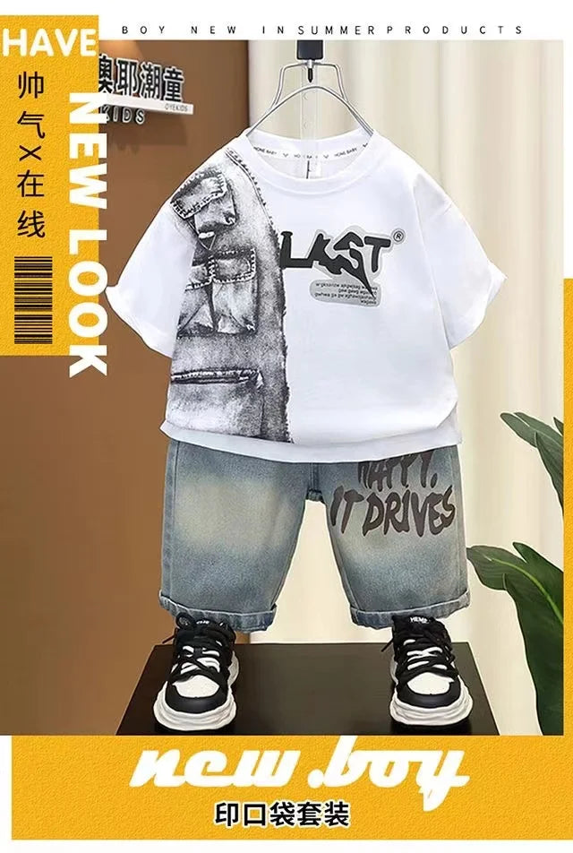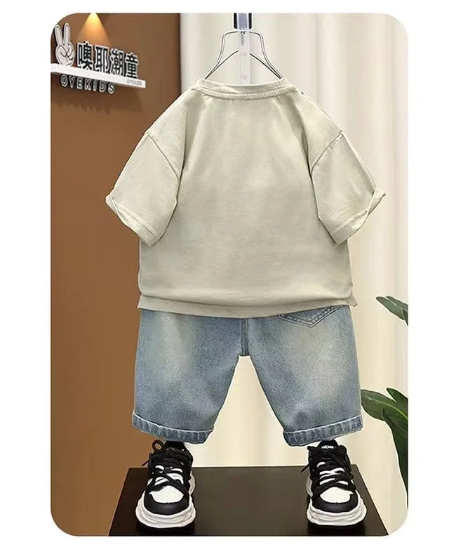 Boys Summer Clothing Set 2024 New Handsome Children's Short Sleeved Clothes Trendy Baby T-shirt Jeans Thin Two-piece Set