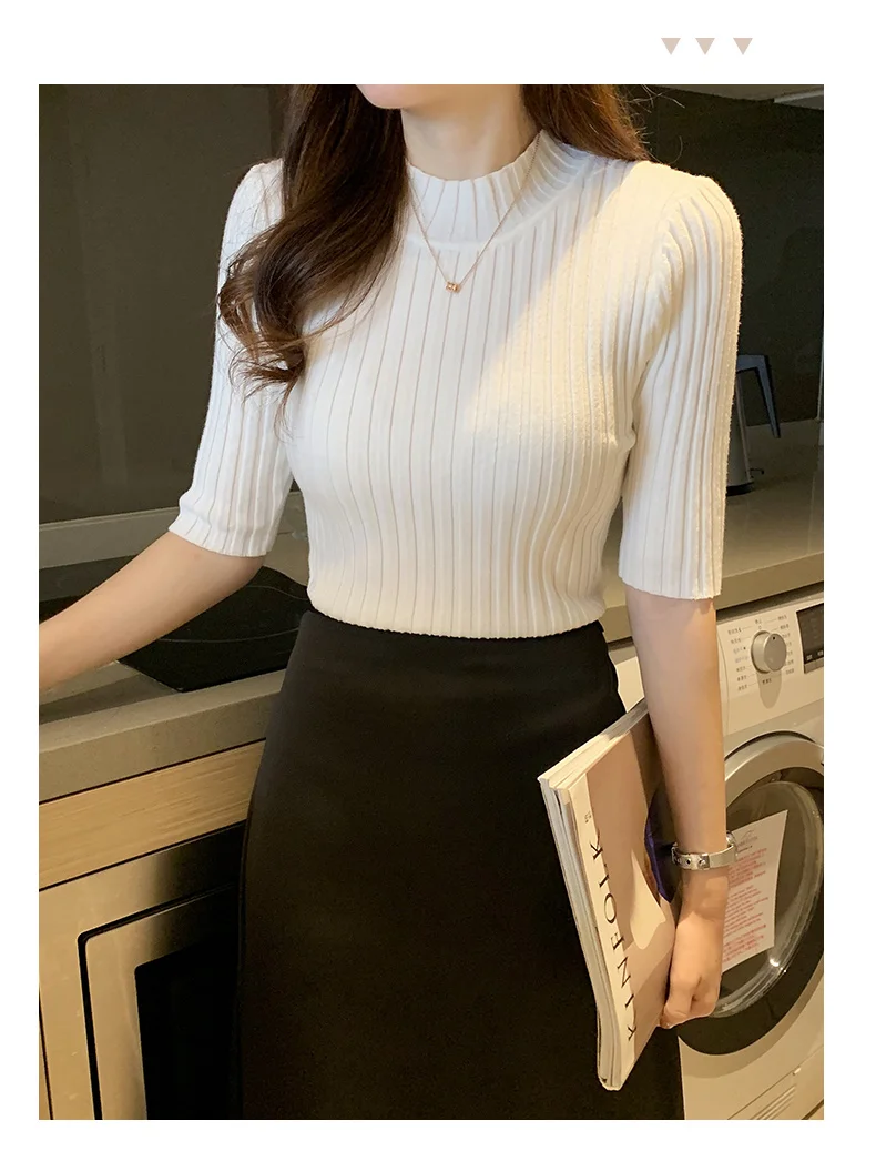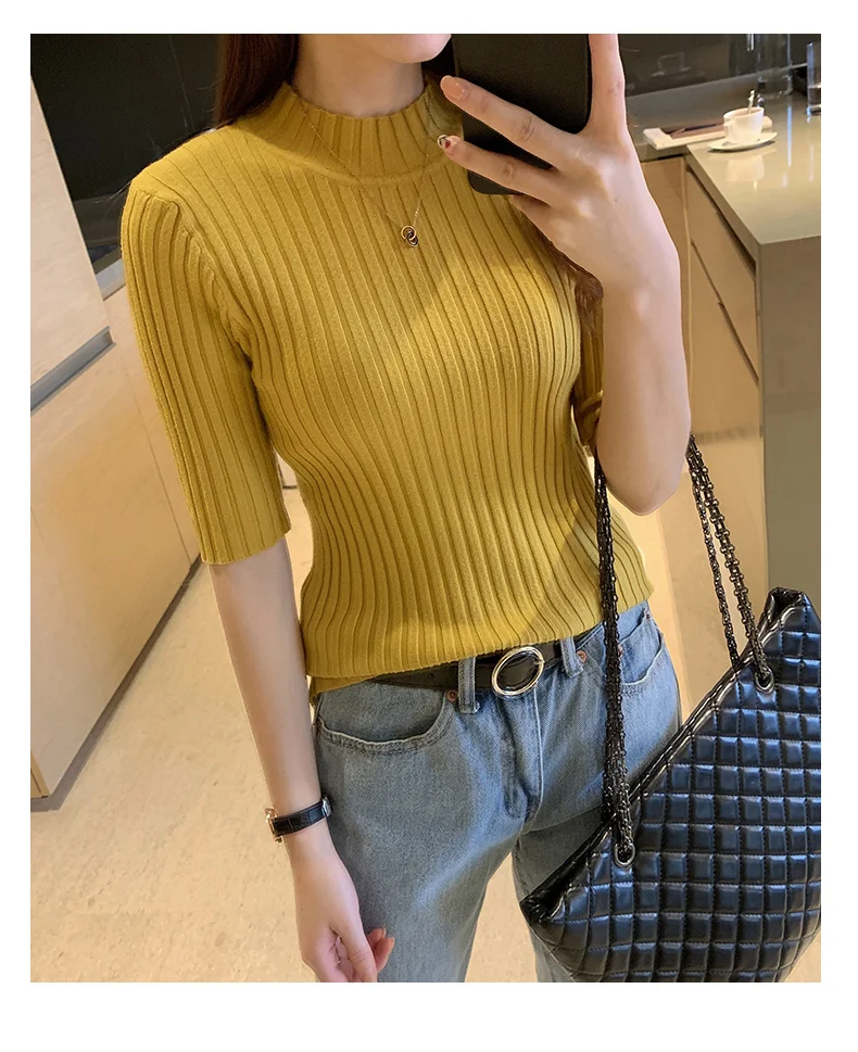Fall Korean Style Women's Sweaters Solid Color Slim Fit Half Sleeve Knitted Pullover Jumpers Basic WomanTshirt T-shirt Tee Shirt