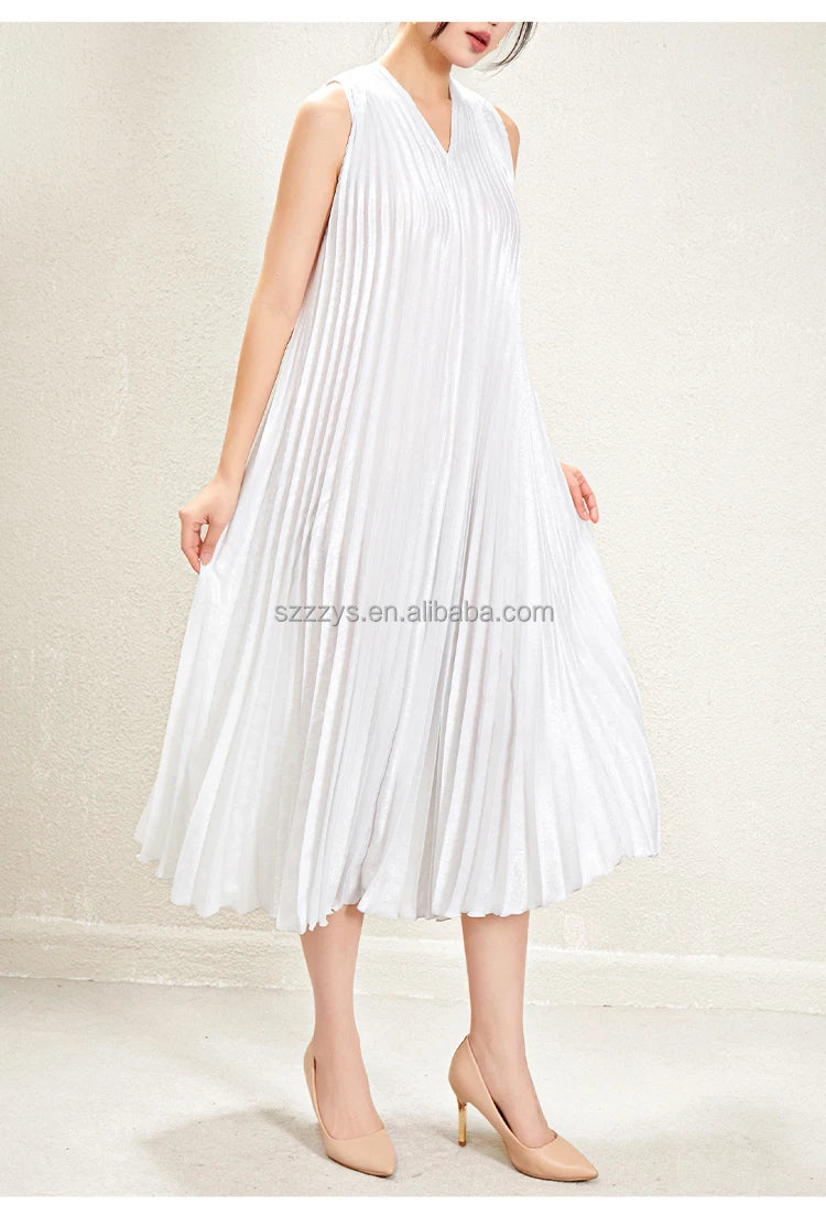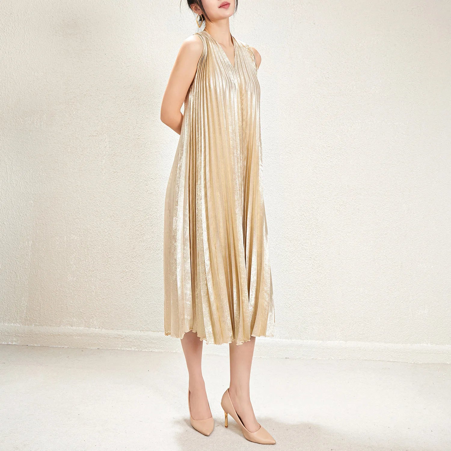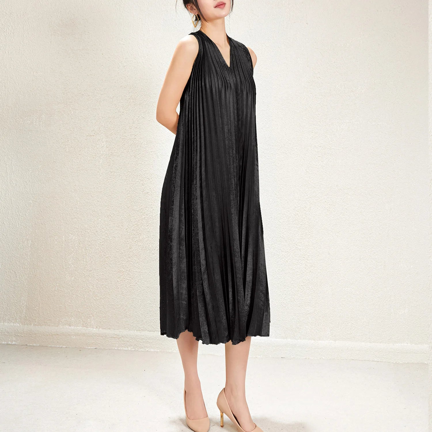 Summer Dress for Women Front and Back V-neck Solid Color Sleeveless Miyake Pleated Loose Casual Fashion Elegant Dress