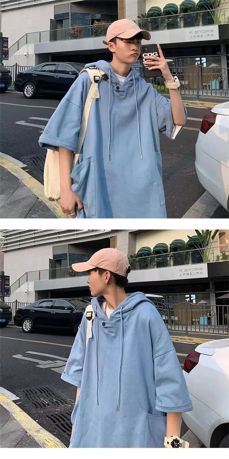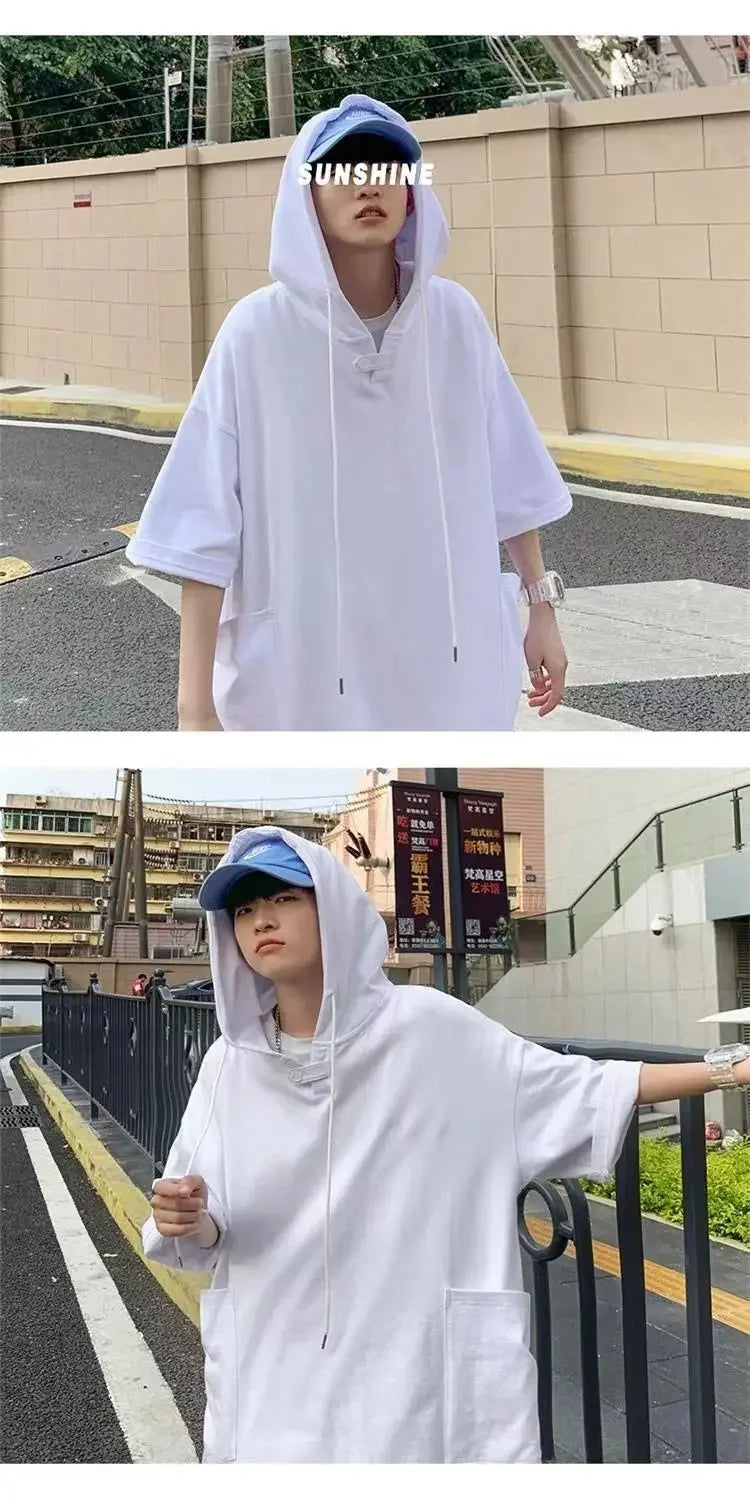 Summer Men's Short-sleeved Sweatshirt with Hat High Street Trend New T-shirt Half-sleeved Hooded Denim T-shirt