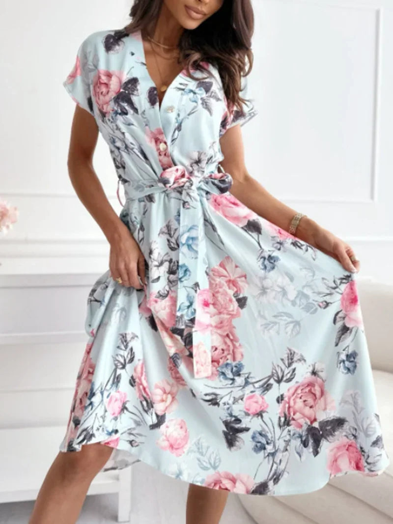 Summer Women's Fashion Flower Print Short Sleeved Dress Elegant V-neck Button Belt Leisure Vacation Dress