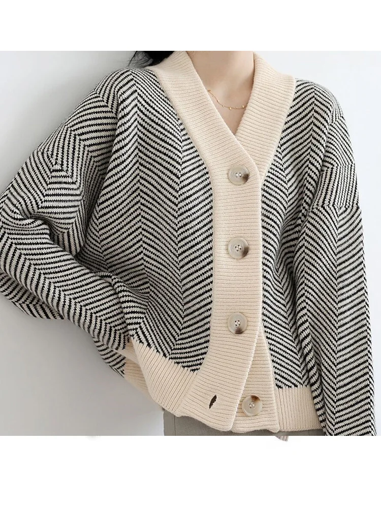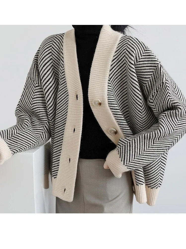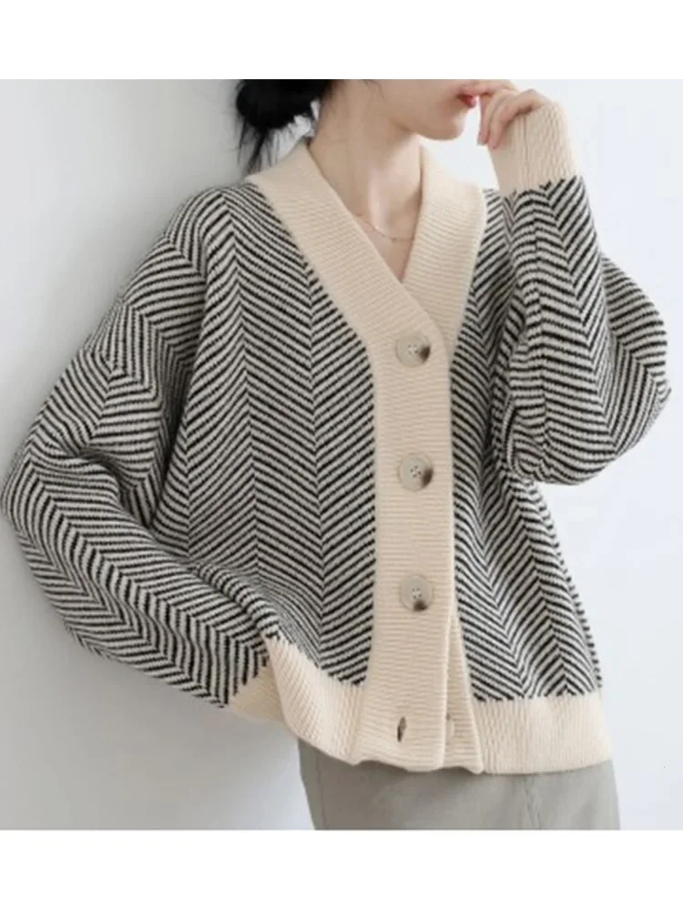 Winter Women Casual Striped Loose Cardigan Sweater V Neck Bottons Sweater Autumn Long Sleeve Knitted Coat Elegant Winter Clothes