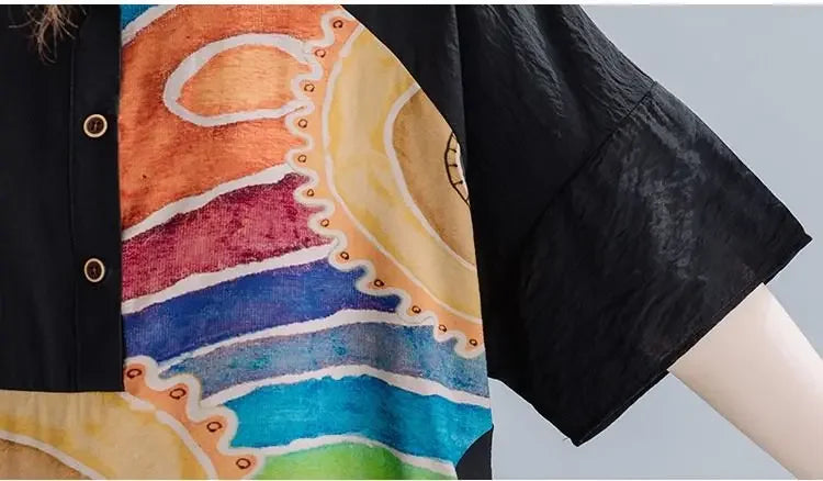 Women Summer Clothing 2025 New Style Literary Splicing Loose Printed Button Splicing Shirt Dress